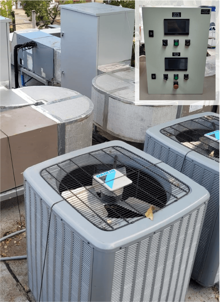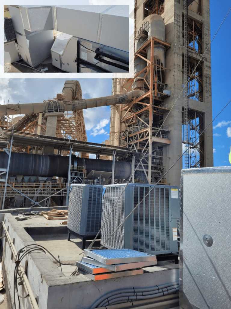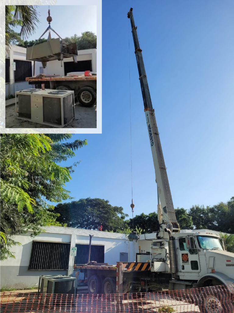 Instalación de sistema de aire acondicionado de 20 ton, a través de dos manejadoras de 10 ton doble círcuito, cada una con 2 condesadoras de 5 ton.
